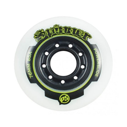 Powerslide Spinner wheels - The best money for value freeskate wheel Powerslide Spinner wheels are without a doubt the best choice for freeskaters looking for that high performance wheel at a moderate price. The urethane offers you all you need - a fast and easy roll, great grip and a long lifespan. Freeskate wheels endure extreme pressures during slides, jumps and stair rides, particularly when the entire body weight is concentrated on a single wheel. In order to withstand the high forces the core of Spinner is made of very durable glass-fiber reinforced composite material. This wheel comes in 84mm / 85A and matt white PU .