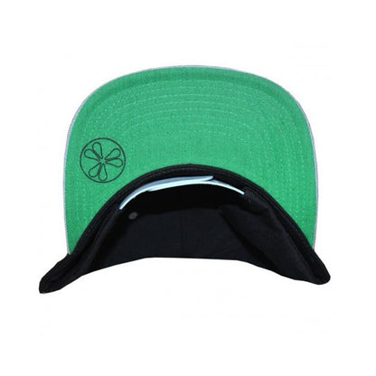 6-panel Flat visor cap. 3 ½" crown featuring a high quality BHC script embroidery, 6 sewn eyelets, with green under-visor with a Circle Icon print . Plastic adjustable strap.