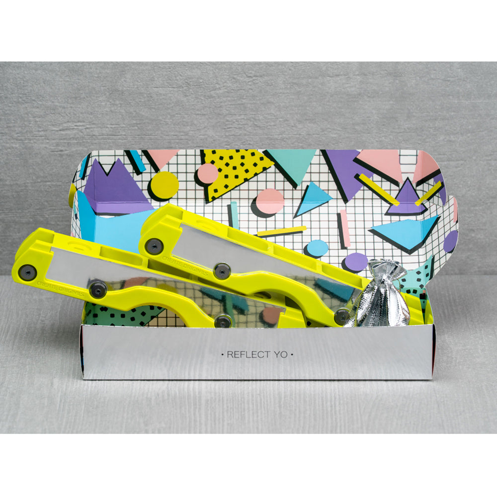 EACH SET INCLUDES: 1 Pair of Frame Cores, Axle Hardware, Sean Kelso Reflect Mirror Graphic Inserts, Clear Shields, Metallic Finish Axle Hardware and Pouch. Comes in a Limited Edition custom Sean Kelso "Reflect Yo" frame carton.