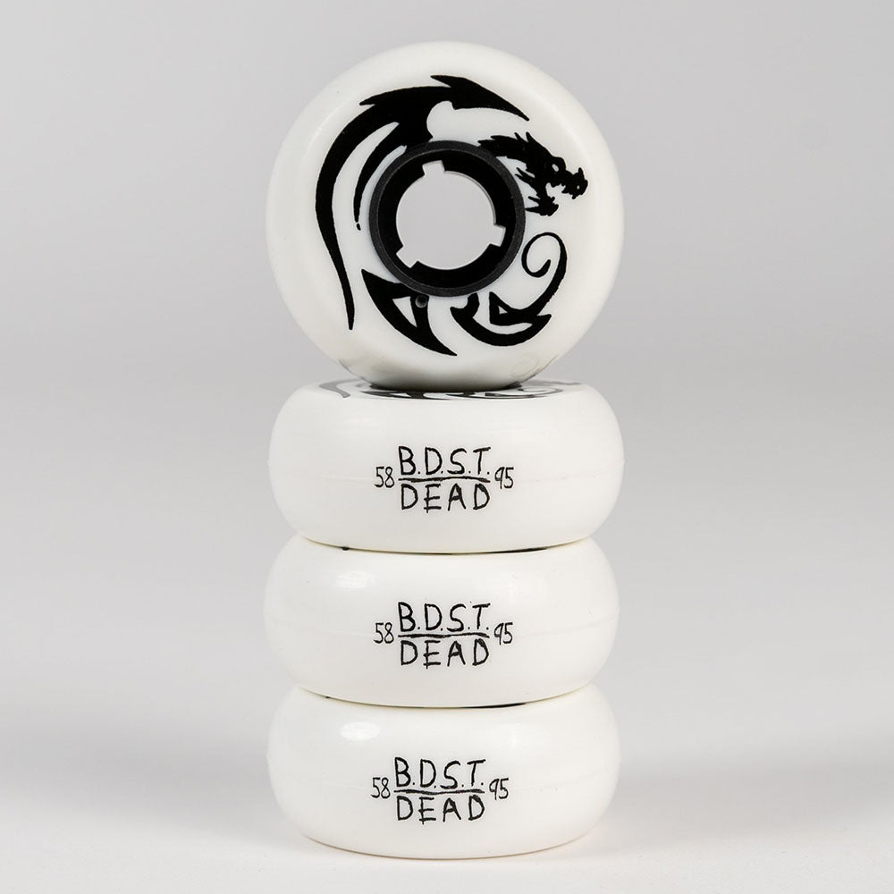We found that 58mm is the best size for all around street and park skating. It is small enough to keep you close to the ground, and stay out of the way while grinding, yet large enough to last you while skating rough surfaces in the streets. We developed this unique rounded profile to provide a natural feeling of fluidity while rolling and turning.Artwork by Ryan Gillett