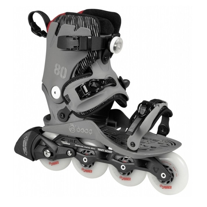 Powerslide Doop Swift 80 inline skates are designed for an urban environment and will give you a fast & eco-friendly lift from A to B. Doop Triskates come with the new TRINITY 3-point mounting to maximize the control and minimize the ride height while commuting. This skate is equipped with the Powerslide 4x80mm casted Elite frame, fast rolling and gripping Powerslide 80mm Spinner wheels and fast WCD ABEC 7 bearings. The size-adjustable Doop step-in skates are convenient, comfortable & easy to handle, as you can skate wearing your own shoes. Roll fast and shine bright with outstanding features like powerful LED lights, reflective stickers and a secure height adjustable braking system for maximum safety. Make it a Doop day! -