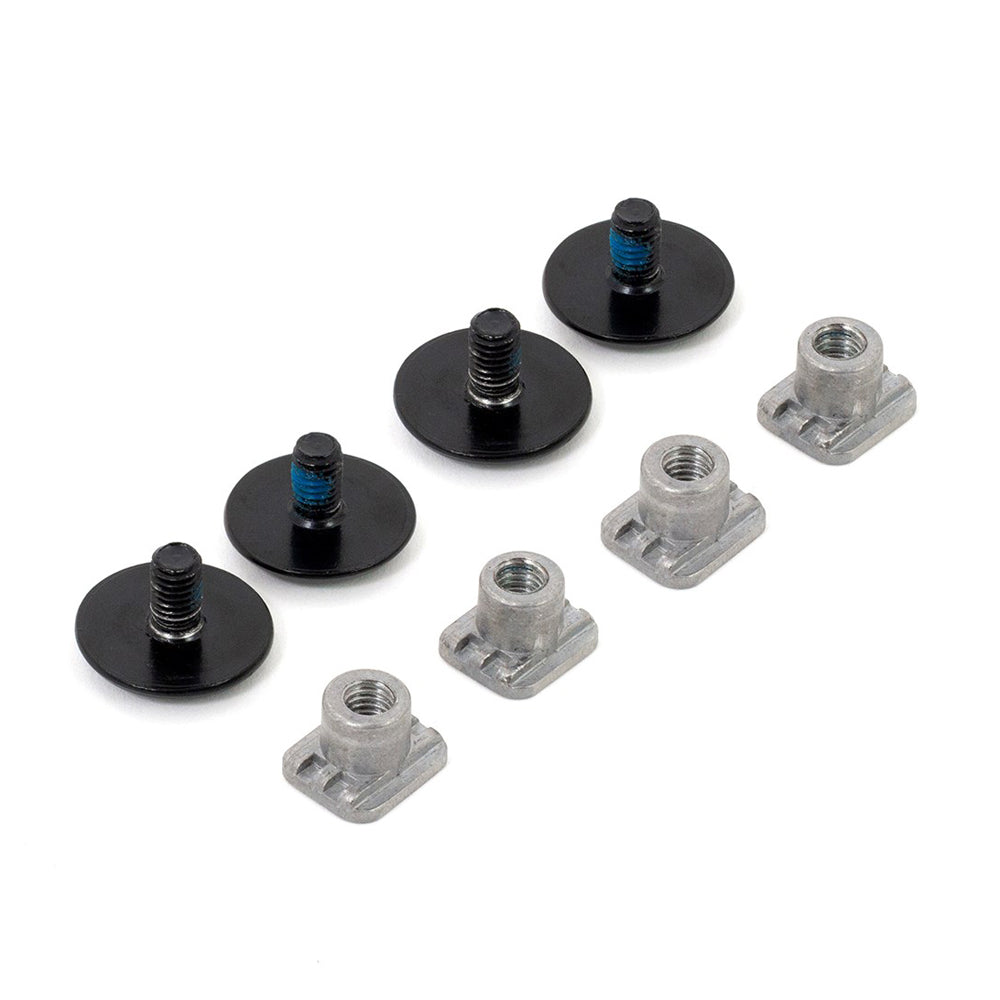 Set of 4 black Echo cuff bolts and adjustable mother plates with adjuster housing to fit inside the Echo shells. This system fits the Echo skates range and allows for the unique 3-step adjustable cuff setup system.