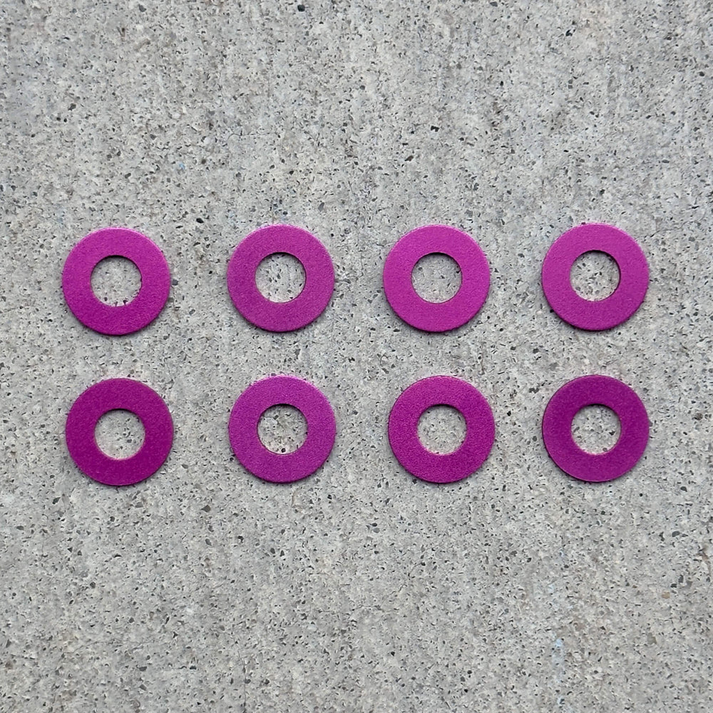 Aluminum Ultra Washers (8-pack) are an excellent upgrade to the stock steel washers that come with many 165 and UFS mount skates. These are especially recommended for those that are seeking the absolute lightest setup possible or for frames that require a little extra wheel clearance.