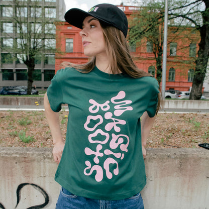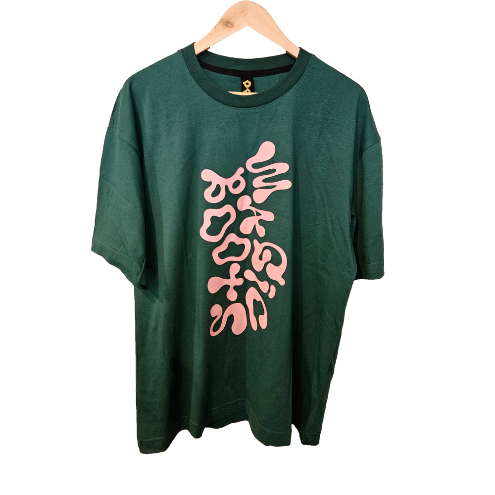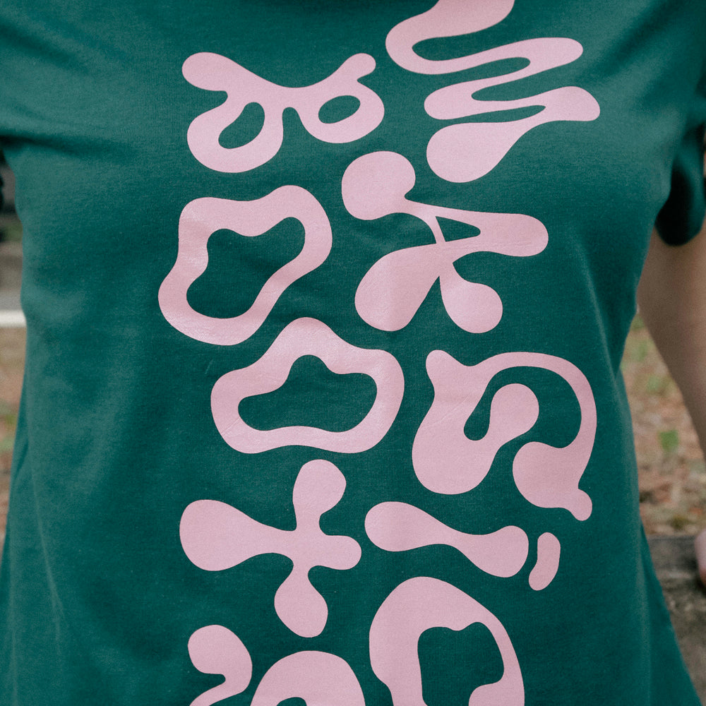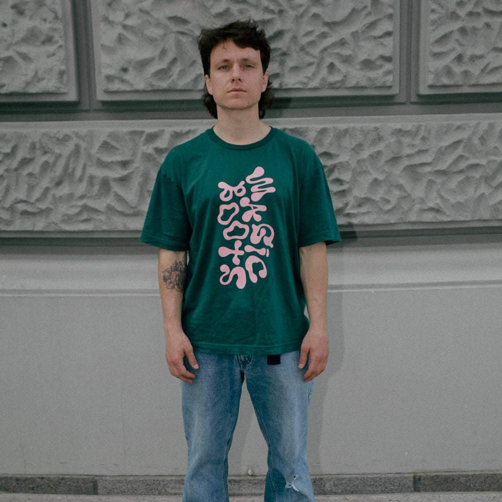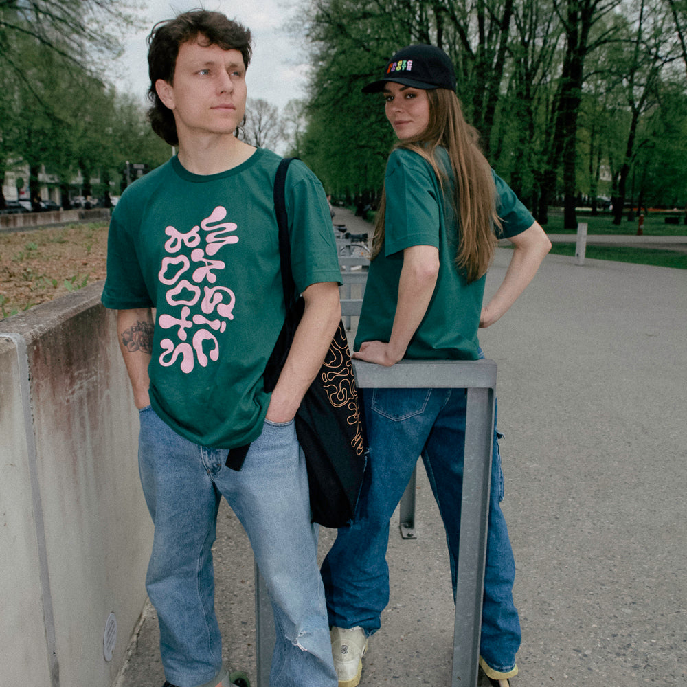 Classic t-shirt with a narrow round rib neck and dropped shoulders. Features large trippy print on front