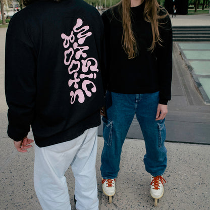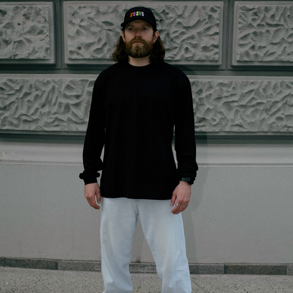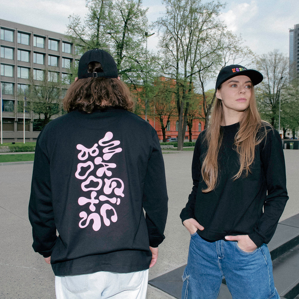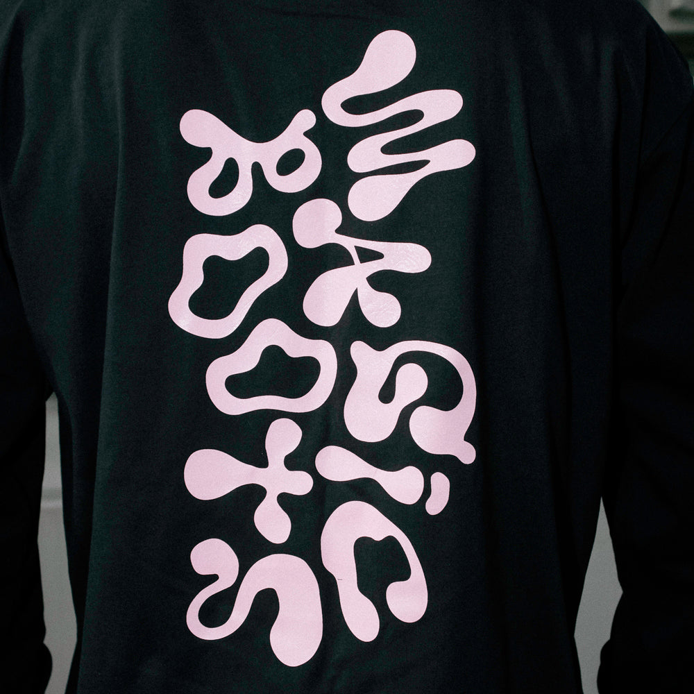 A soft boxy unisex longsleeve t-shirt with a narrow round rib neck and dropped shoulders. Feature large trippy print on the back.