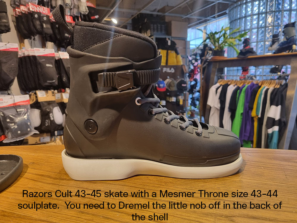- Soulplate size 43--44, also fits on Razors Cult 43--45 if you grind of the thingy at the back of the shell.