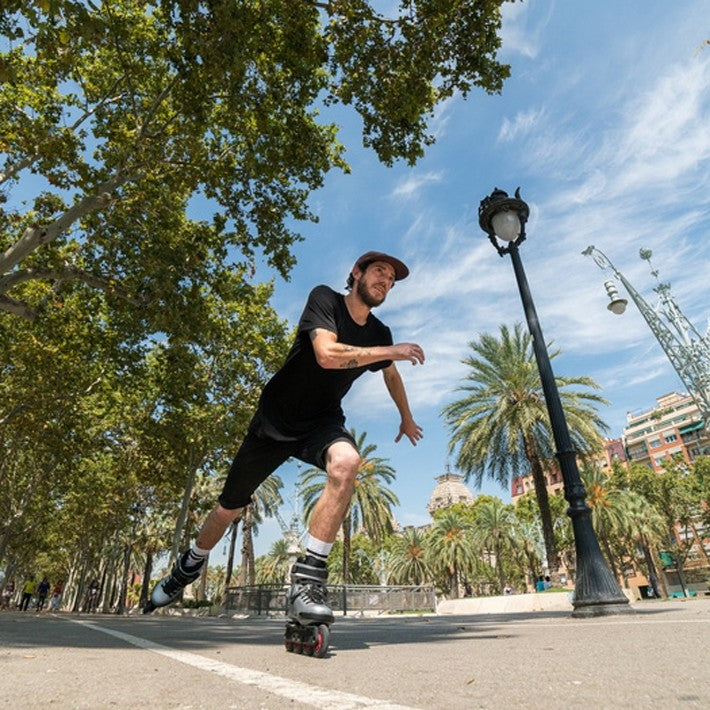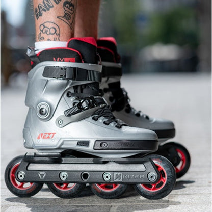 Next Boots are known for their various custom options, great comfort and incredible performance. The Flux frame verifies Kizer´s advanced thinking, now combining the best of all - Triskates, TRINITY and 4 wheels. It´s a multifunctional frame, which gives you the option to switch from 4x90mm to 3x100mm with ease.Both setups are fast but still agile. The triangle shaped rocker spacer allows you to adjust not only the height of the wheels, but also the length and puts you as low as possible to the ground. The frame is made out of nylon composite material, tough and ready to slide and grind out of the box and will guarantee endless fun. The front and rear wings make soul slide and stalls easy and will give skaters a lot of variations to blade the urban jungle. This great skate gets completed by Powerslide Spinner 90mm / 88A wheels and Wicked ABEC 9 freespin bearings. Kill boredom and get your pair of Next Burgundy Grey 90 skates!