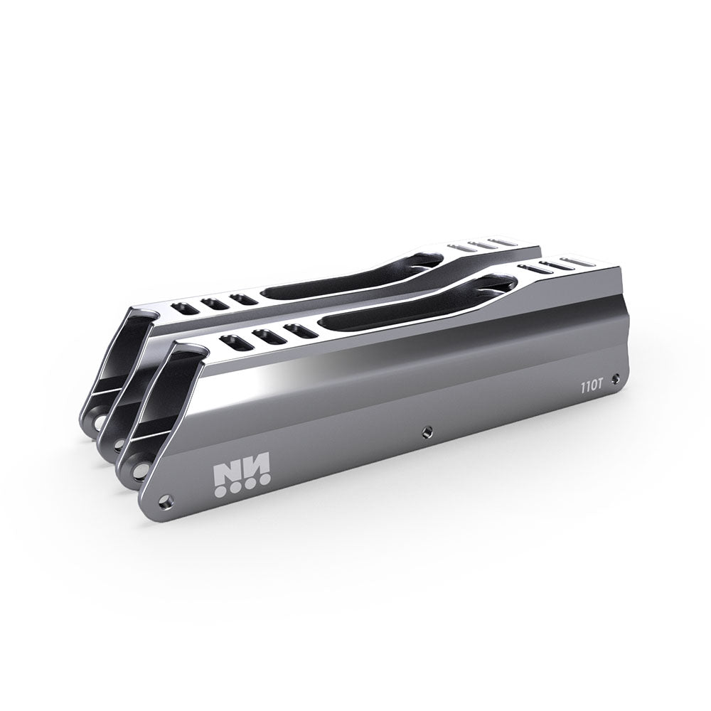 The NN 110T is the world's first "V" rockered 3x110mm frame. Tied with the shortest frame in the NN Family, and yet also tied as the frame with the biggest wheels... this amazing combination fuses the extra maneuverability of a "V" rockered 255mm frame with the smooth ride of big 110mm wheels. As a "V" rockered frame, it still gives you more control at higher speeds than a deeper rocker would. If you are already a fan of the 3x110mm setup, you're going to be an even bigger fan of the 110T.
