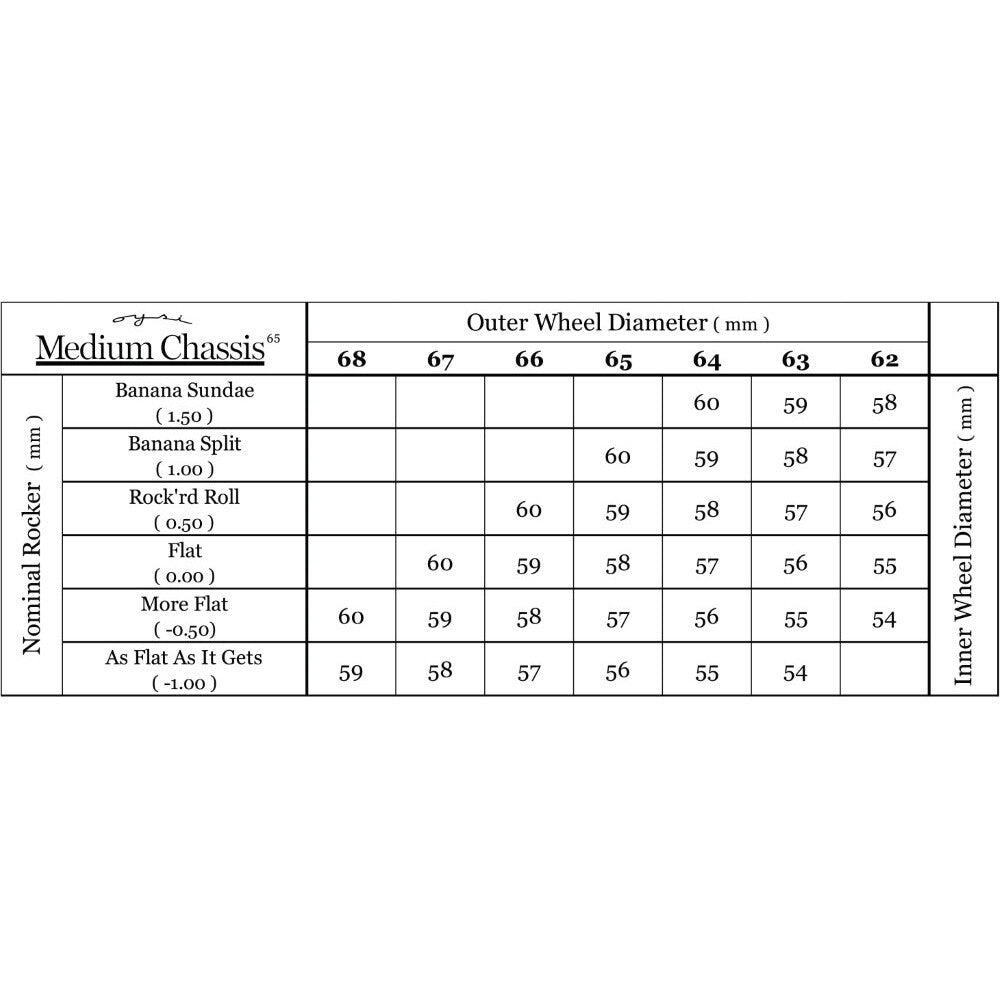 The Oysi Medium Chassis65 is designed to ride flat using a combination of 65mm outer and 58mm inner wheels and is available in either 257mm or 269mm wheelbase lengths, both providing the same thoughtfully contoured groove centered between a 127mm middle wheel split.