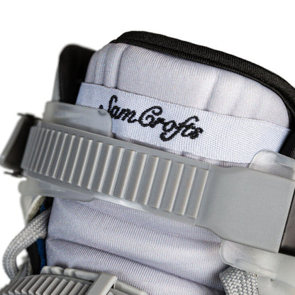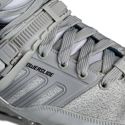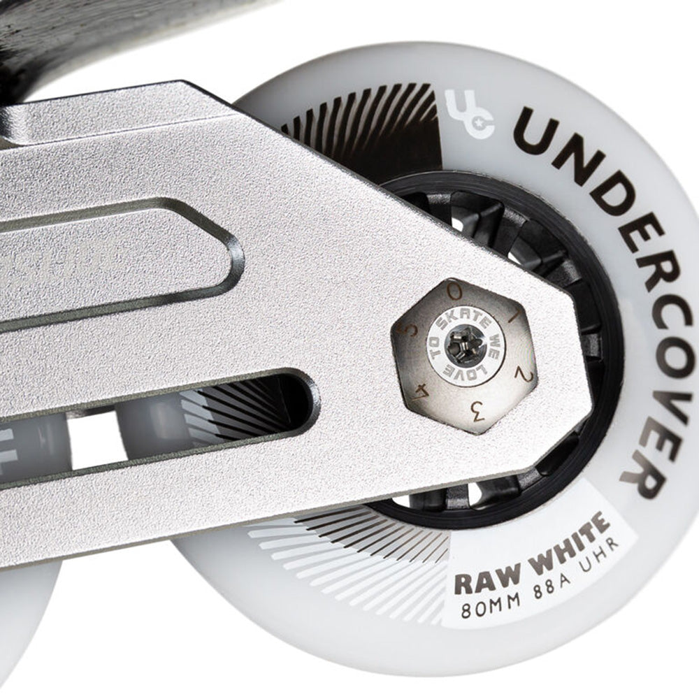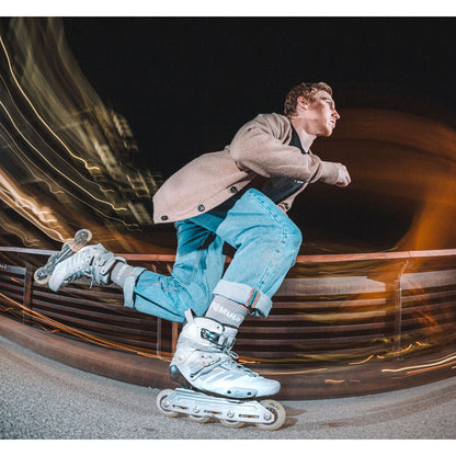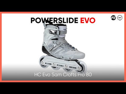 "For my first signature urban skate, I worked alongside the Powerslide design team to create my own personalised version of the brands flagship skate, the Hardcore Evo. I modified the design to meet my exact requirements, creating a skate specifically bred for intense urban and freeride skating. I'm very proud to present the Sam Crofts Evo 2022. Using the 2021 Hardcore Evo silhouette as the designs base, I firstly chose to remove the toe straps and toe caps as I don't do slalom and I'd already been removing these from my other HC evo's for some years now to help give the skate a more classic sneaker aesthetic. Having always loved skating at night and also taking inspirations from some of the my current favourite shoe designs I created a 3M reflective based design. Including full reflective side panels, hockey style waxed laces with 3M reflective flecs and reflective carry handles and accents. This created a dual look skate, a cool grey and silver model in the day, but with a completely unique 3M reflective look that really pops at night. I also added a slightly softer than usual clear cuff for increased comfort on longer sessions but still giving ample support on gaps and slides ect.. The complete skate comes with the latest urban TRINITY mount masterpiece from Powerslide, the Combat Rocker Frame in 4x80mm. For myself, given the frame's new rocker system, the 4x80mm Combat is the optimal set up in terms of balancing both agility and stability, with its 260mm length and multiple rockering options. And what´s really cool about the Combat 80 frame is the fact that you can even ride them with 84mm wheels. The Powerslide Combat Rocker Frame is designed to be the ultimate inline freeride frame, at the heart of this new frame are the revolutionary HXG rocker spacers. The hexagonal spacers can easily be adjusted to six different positions, meaning each wheel can be rockered individually creating an almost endless range of rockering options so you can really tailor the skate to your own personal needs. The frame is light and strong, constructed from 6061 aircraft aluminum and CNC machined to perfection. The minimalist design and unique triple void construction give the Combat frames exceptional performance. I chose this in a classic industrial silver finish to complement the skates overall look. Finally as an Undercover Wheels pro rider I of course added some of their high speed Raw White 80mm wheels and Wicked Abec 9 bearings. This is without a doubt the best urban model I have ever used, it's a real dream come true to see this design come to fruition and share my vision of the HC Evo with the urban world" - Text by Sam Crofts