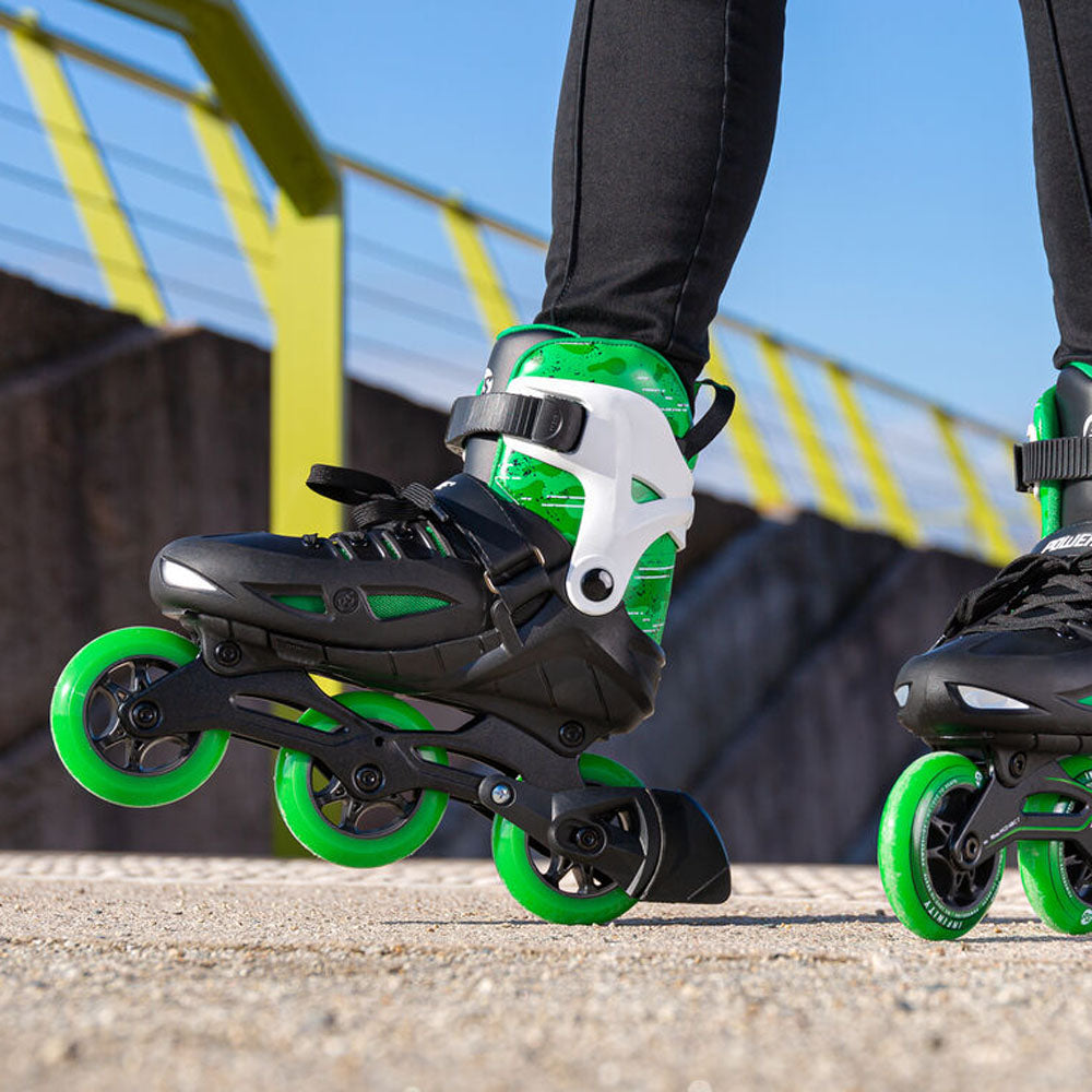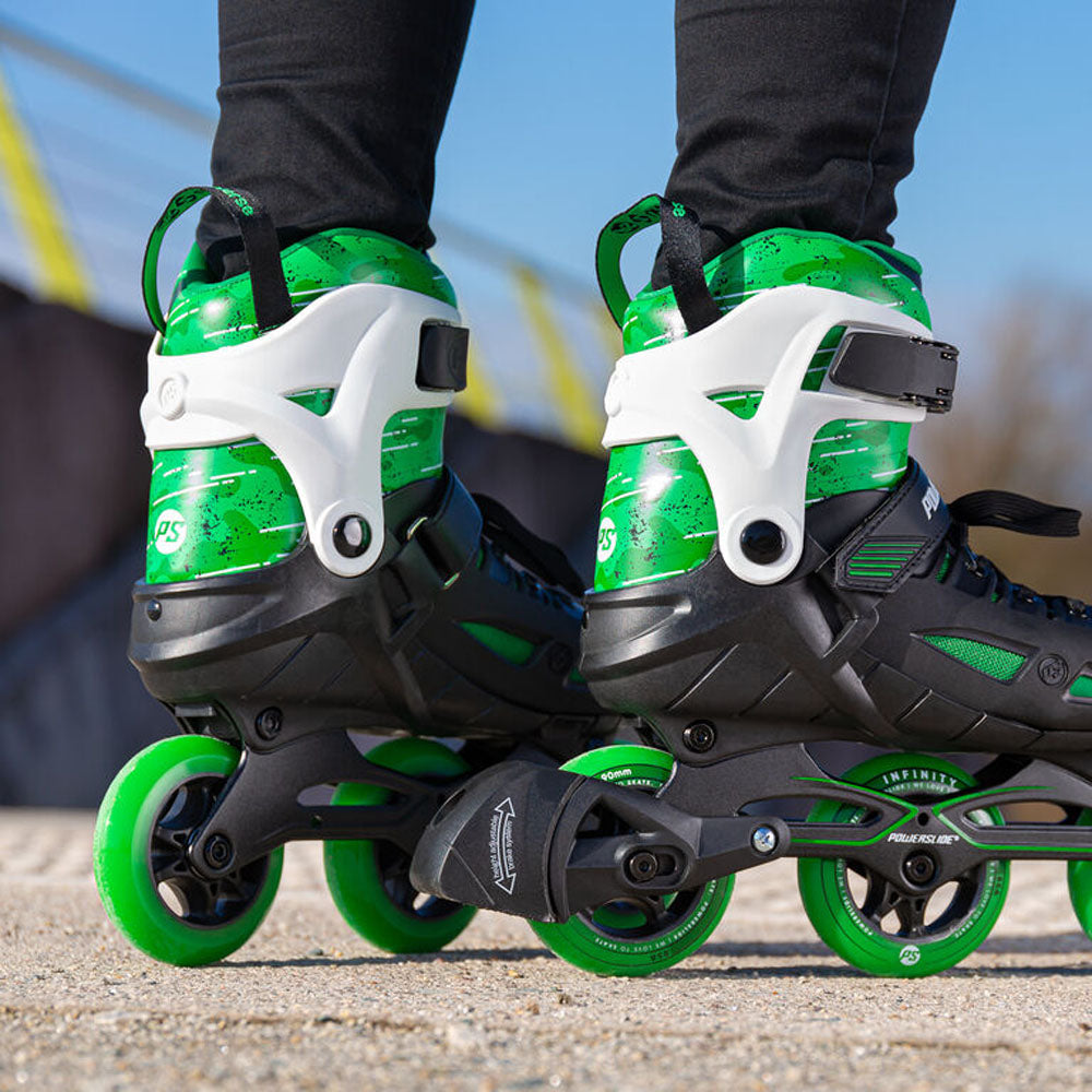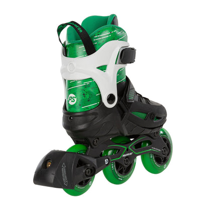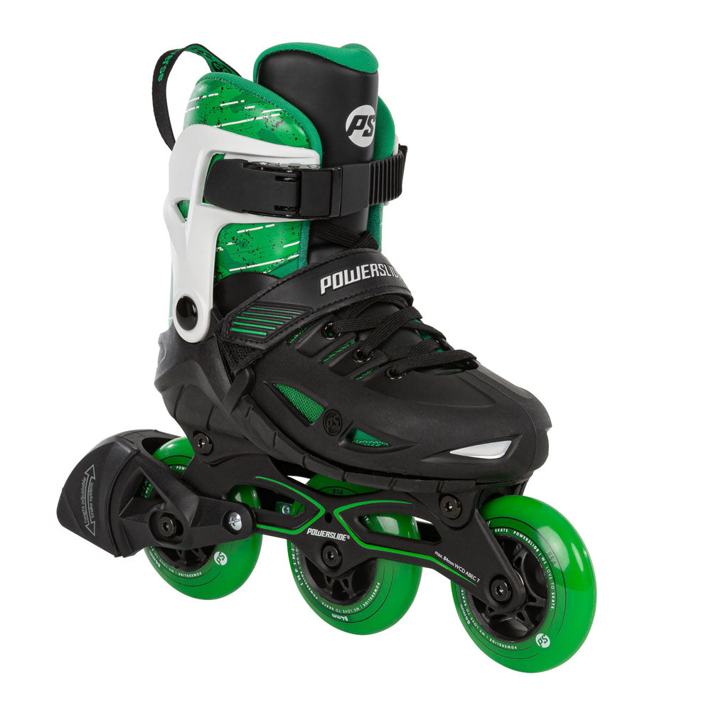 The POWERSLIDE Phuzion Universe Green inline skate for kids is a stylish, size-adjustable skate that’s supportive, fast, and lots of fun. The skate has a strong, light boot with a sleek black-green colorway that your kids will love to skate on all day long. The durable shell is designed to take everything your kids can throw at it and more. We all know kids grow quickly. The size-adjustable POWERSLIDE Phuzion Universe inline skate is a great investment because it grows as your child does. Have confidence knowing your little roller will have a comfortable, well-fitting skate for a long time to come. The POWERSLIDE Phuzion Universe Green comes with a fast and stable 3-wheel set-up, making the skater lighter and offering improved control over a traditional 4-wheels set-up. Safety is guaranteed thanks to the Height Adjustable Brake System (HABS) which gives your child the control they need to stop with confidence. Complete with POWERSLIDE Infinity wheels and WICKED ABEC 7 bearings, the Phuzion Universe Green is a good-looking versatile inline skate your kids will love. Cruise around the streets with friends, play a game of pickup hockey with the neighbors, or spend some quality time rolling around with family - the POWERSLIDE Phuzion Universe Green inline skate for kids can do it all.