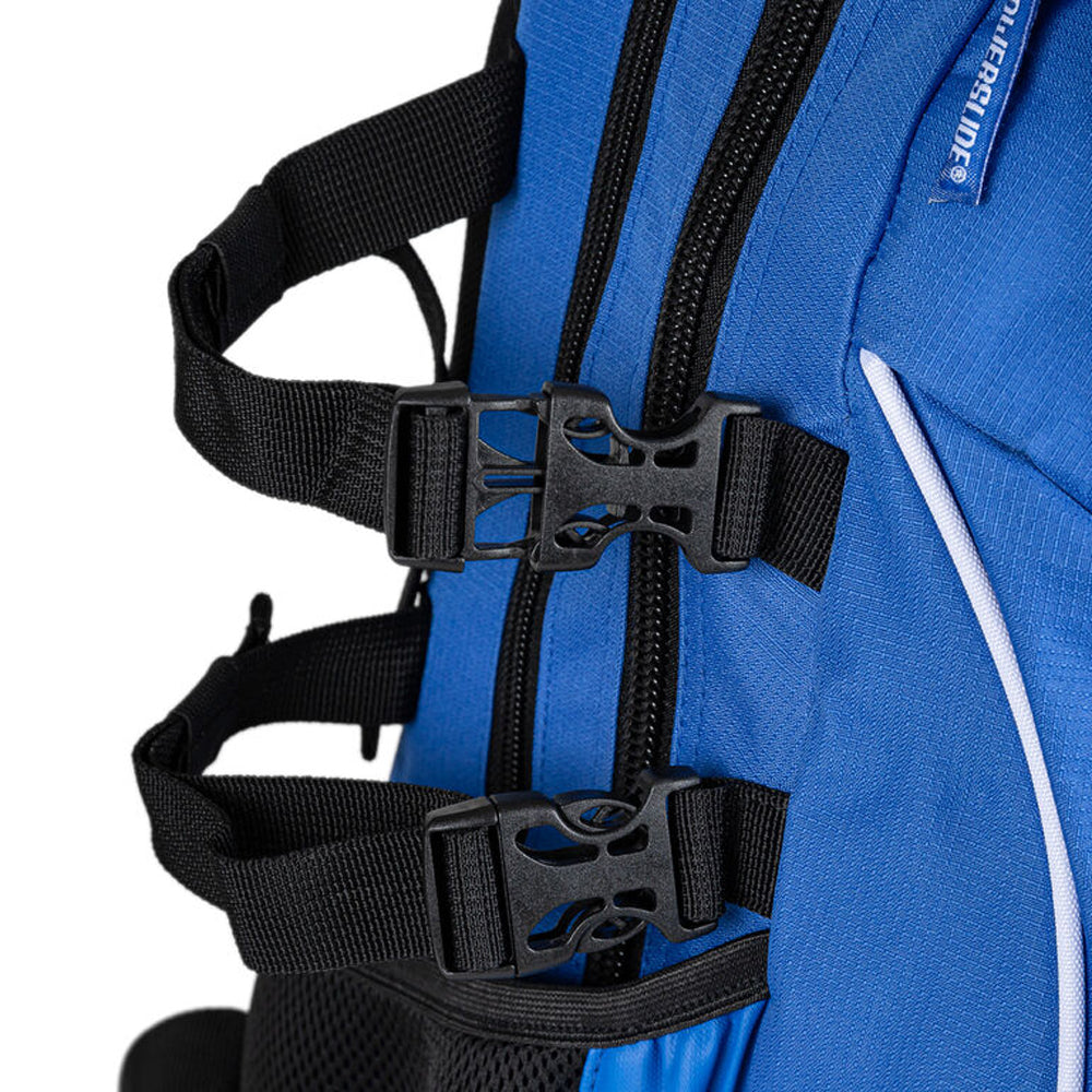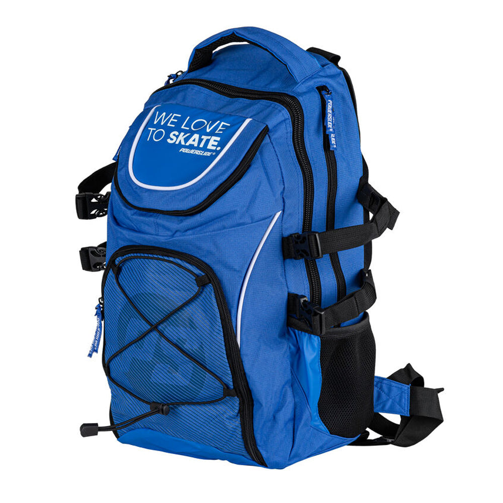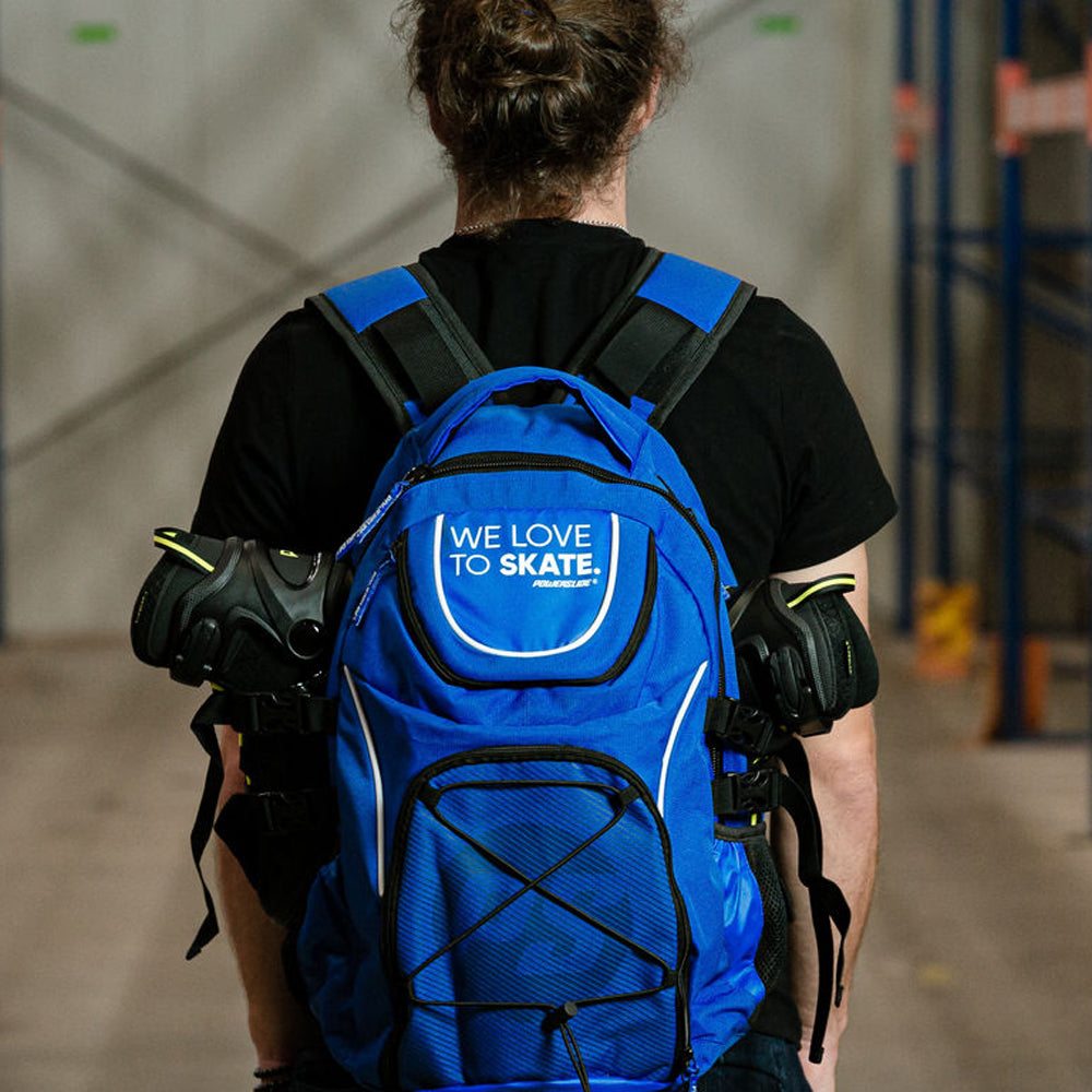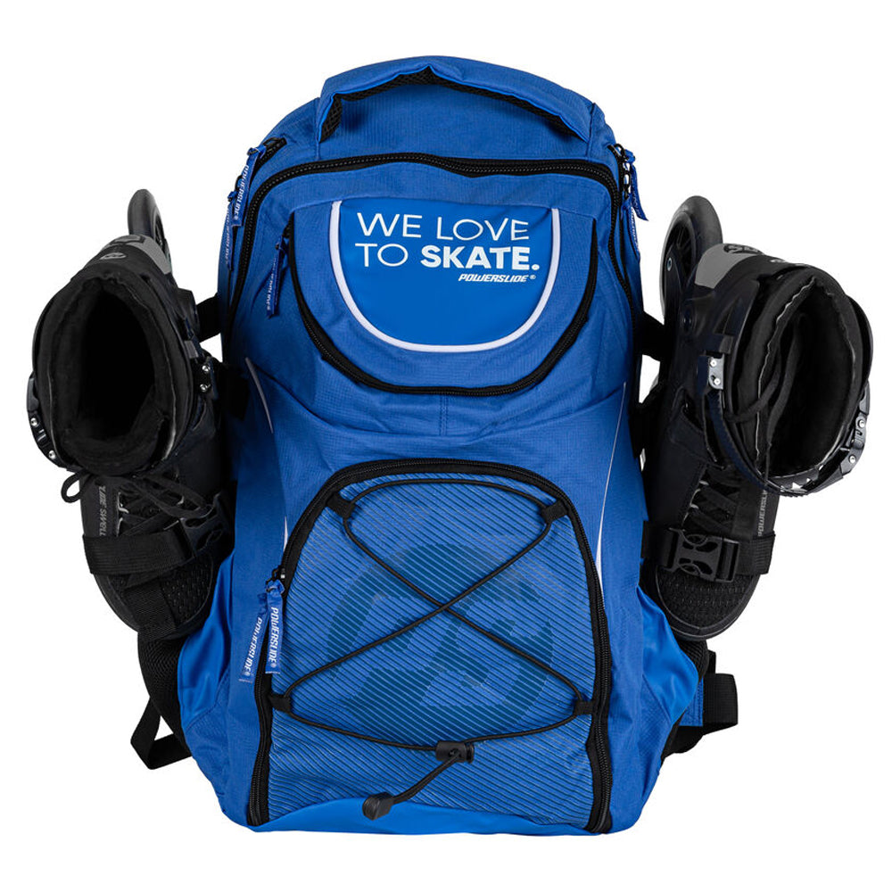 The Powerslide WeLoveToSkate backpack provides the best possible storage and security for your precious skates. A skate backpack should meet various criteria. Powerslide bags have been specifically designed for skates to hold and carry securely. Additional features have been considered. Made from tear-resistant Nylon this bag includes additional storage for accessories like your helmet and protection. A stretchable, padded carrying straps take away pull forces and offer great comfort even when the backpack is fully loaded. Both, the front and bottom compartment can be zipped off and with the included shoulder strap your front pouch can be transformed into a bag that you use when traveling to have easy and fast access to your important documents. The WeLoveToSkate Backpack is the perfect organizer for your personal belongings at training sessions and competitions.