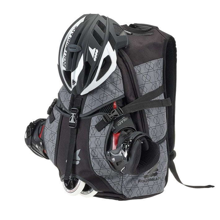 - EXTERNAL REAR SKATE HOLDER & convenient helmet clip to free up internal space. Wet pocket storage on bottom for dirty shoes or clothes. The rear holder keeps wheels from touching the body or clothing.