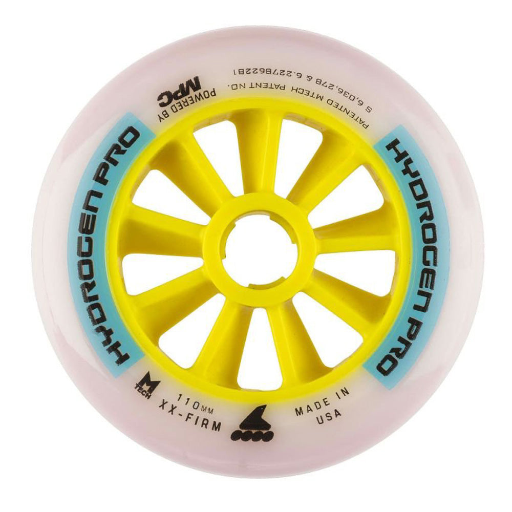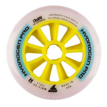 Hydrogen Pro wheels are made in the USA with the highest quality materials, standards and attention to details to be used during all race conditions and leisure skates for consistent, top-end performance on road, track, long distance and sprints. provides the extra speed required for athletic competitions. excellent, consistent performance, superior control in turns, great speed all track/speed competitionsThey incorporate a multi-layer technology, Mtech®, which is comprised of two layers of urethane to provide the ultimate footprint (for grip), rebound (speed/energy return), roll and wear. This combination with the core makes it the most responsive wheel you can put on your skates. Hydrogen Pro 110mm XX-Firm wheels excel in sprints and track races to provide optimal performance, perform well in all conditions. Made in the USA with an exclusive dual-pour urethane formula, the outer ring enhances wear while the inner ring improves mechanical grip. XX-Firm deliver the highest durability, grip extremely well on smoother surfaces, have a high level of stability and optimum in straight line speed