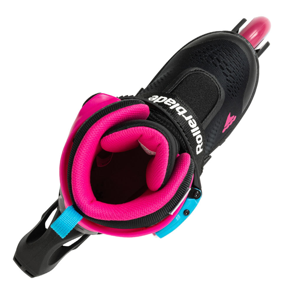 Microblade Free is a high-quality, lace-free adjustable skate for kids. Using Rollerblade expertise, skates are adjustable four full sizes. An easy-to-use extension system works with the push of a button and markers in the toe area align the skates to the correct size. Junior Fit support includes an engineered mesh for breathability and provides enhanced comfort. A durable frame design lowers the center of gravity to improve stability, balance and control. 72mm Rollerblade wheels with SG3 bearings are ideal for kids and upgrading to a faster Microblade 3WD can be achieved later by purchasing larger wheels; brake is standard. Microblade FREE is the frustration-free choice for kids.