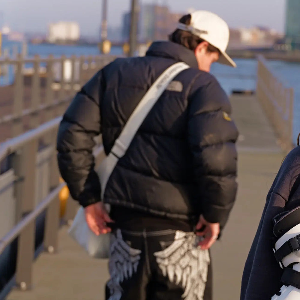 It includes a belt that can be attached while skating to fix the bag in place and prevent swinging.