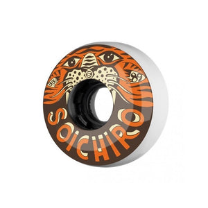 The Soichiro wheel features a Tiger print on an orange background.Eulogy wheels is one of the oldest and best wheel brands on the market today. They are made in the United States in collaboration with Bones Bearings. There is no other inline skate wheel brand that has the same Poly Urethane as Eulogy wheels has.