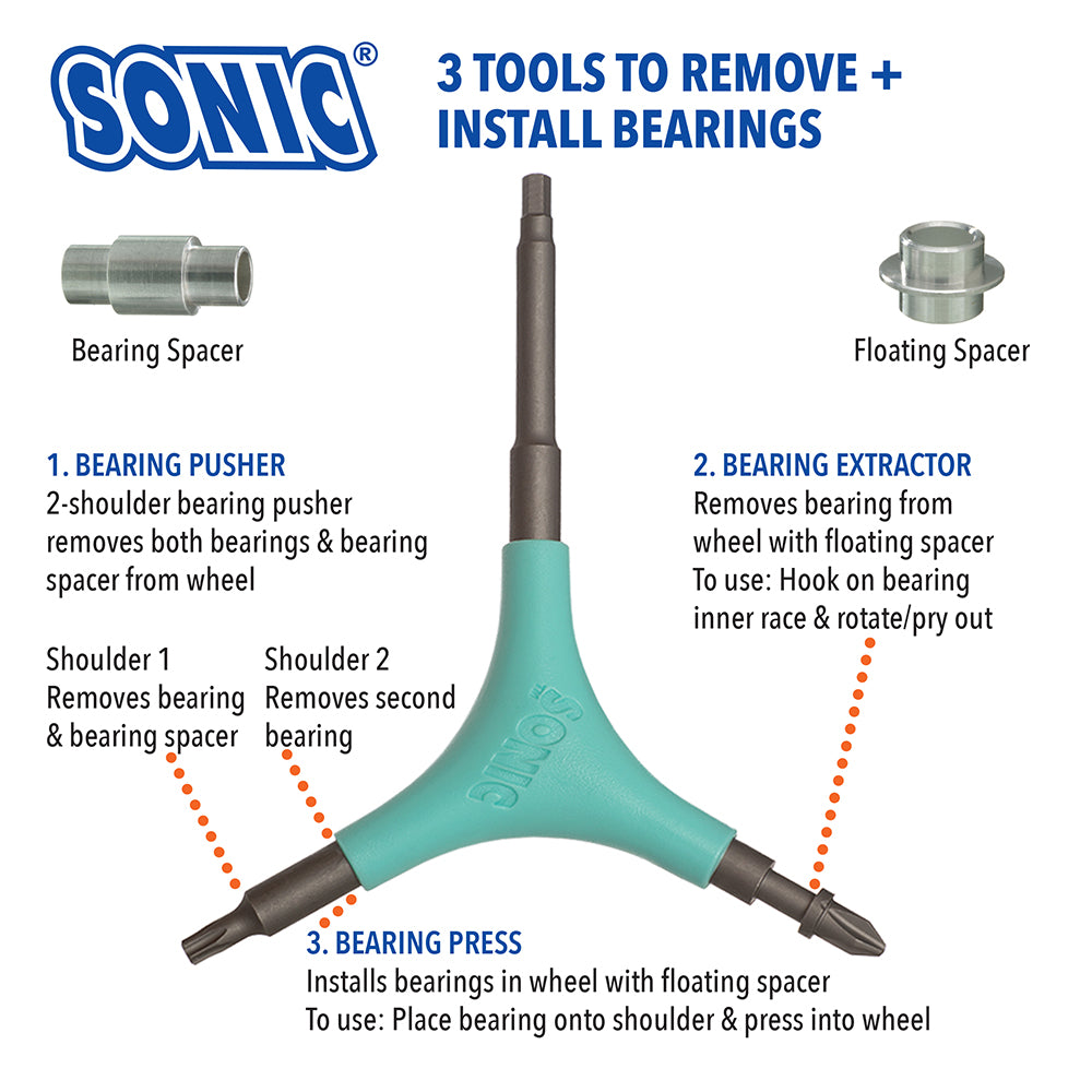 Sonic Pro Skate Tool + H fits 3 and 4 wheel inline skates. The long 4mm hex makes it easy to reach frame mounting bolts to laterally adjust or remove frames. Includes a torx tool and more (7 tools in all). The long 4mm hex tool often allows for tri-skate frame adjustments without having to remove wheels! Made with premium S2 tool steel.