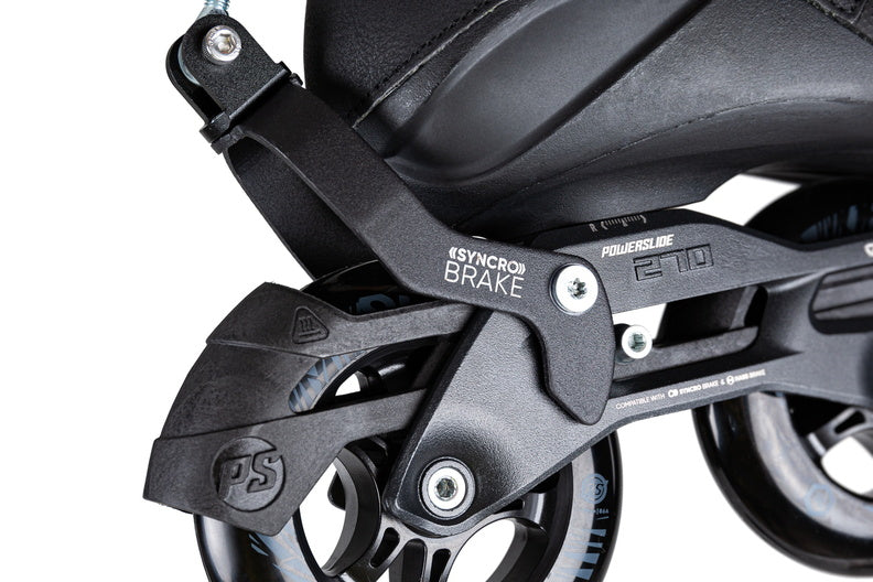 Designed around the advanced POWERSLIDE Swell fitness skate collection, the Swell Triple Black Syncro 110 gives you a sleek style, high-performance, and an innovative braking system that augments safety and gives skaters ultimate control and confidence. The skate starts with a sleek black boot that’s light, and comfortable. Engineered with patented 3DAP® technology from MYFIT. Made of cast PU, this revolutionary technology molds perfectly to your foot, delivering control and comfort as that’s unmatched in the fitness market. The upper portion of the Swell Triple Black Syncro 110 is made of a new breathable mesh with TPU welded reinforcements to reduce weight and increase durability. The highlight of the skate is the new groundbreaking brake technology known as Synco brake. The responsive brake system gives you more control while stopping and brings you to a stop faster than traditional brakes while keeping all wheels on the ground - there’s no need to lift your heel to slow down. Complete with the famous TRINITY 3-point mounting system, you get a low center of gravity that improves stability and power transfer. The TRINITY system also allows you to adjust the frame position to match your individual skating style. The Swell Triple Black Syncro comes with a light and responsive 270mm Elite cast frame riding on fast 110mm Swell wheels and smooth WICKED ABEC 7 bearings. A stylish, high-performance inline fitness skate with advanced safety features, the POWERSLIDE Swell Triple Black Syncro 110 is ready to bring your workouts to another level.