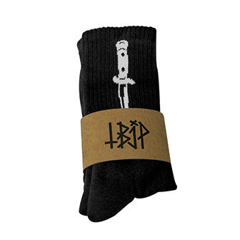 Super comfy, soft, thick black socks with a white dagger woven in on the top and TBJP Logo on the bottom.
