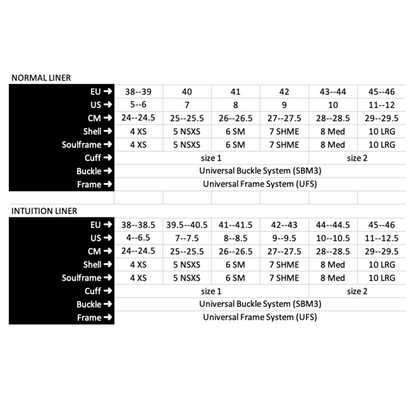 SHELL 10 LRG - Size 11 to 12,5THEM LINER INTUITION LINER MONDO POINT INTERIOR SHELL LENGTH EURO SIZE (ESTIMATION) US 5-6 US 4- 4.5, US 5- 5.5 8 US 6- 6.5 24 - 24.5 25.9 cm 38-38,5 US 7 US 7-7 5 25-25 5 26.9 cm 39,5-40,5 US 8 US 8- 8.5 26 - 26.5 27.9 cm 41-41,5 US 9 US9-9 5 27-27 5 28.9 cm 42-43 US 10 US 10- 10.5 28 - 28.5 29.8 cm 44-44,5 US 1 1 - 12 US 1 1 - 11.5 & US 12- 12.5 29 - 29.5 31.4 cm 45-46 -