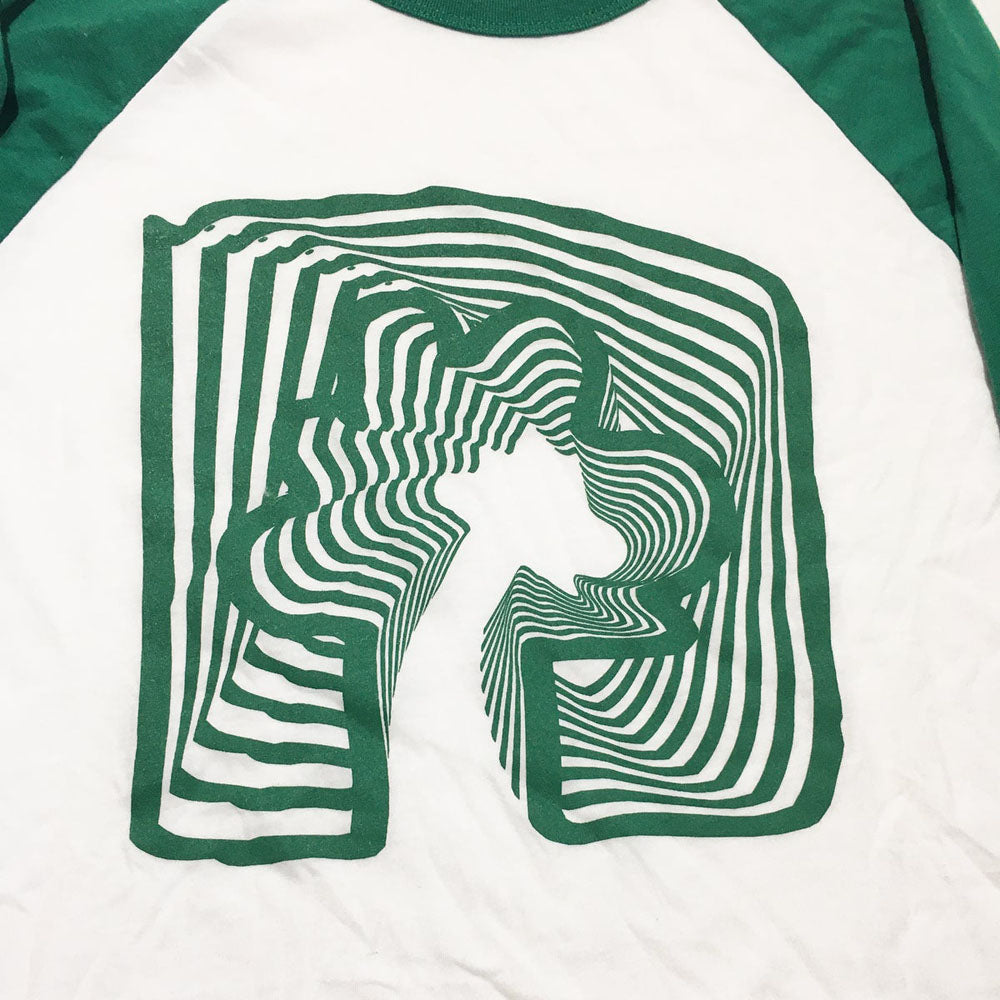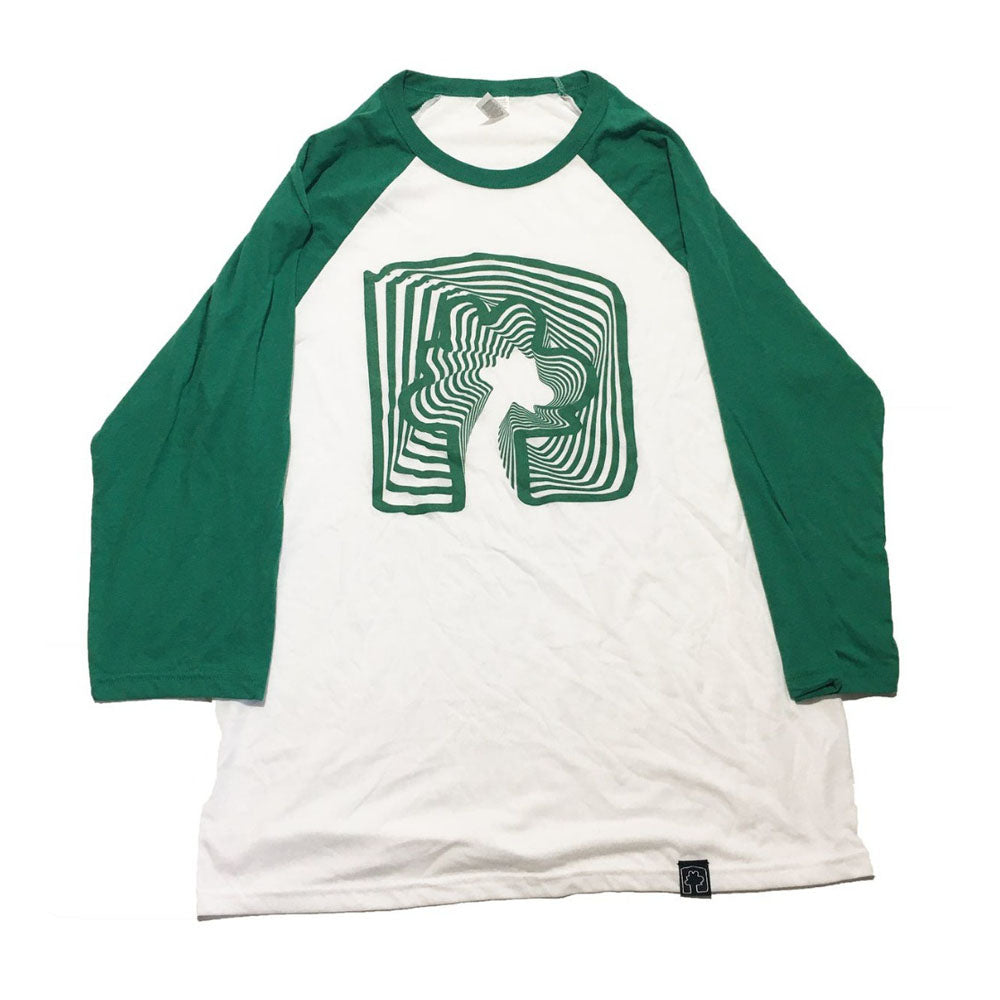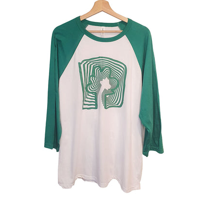 the psych design on a baseball shirt, black print, black 3/4 sleeves, tree label.