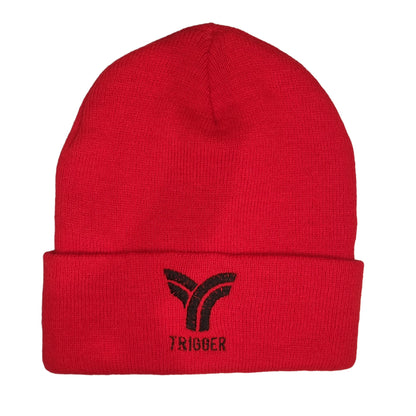 Red regular fit beanie with embroidered Trigger logo on the front.