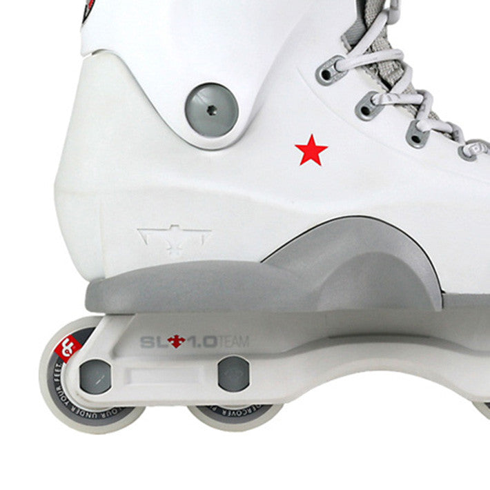 The soulplate is what differentiates any freestyle skate from an aggressive skate. It is the piece of plastic mounted between the boot and the frame and it is used solely to grind on.