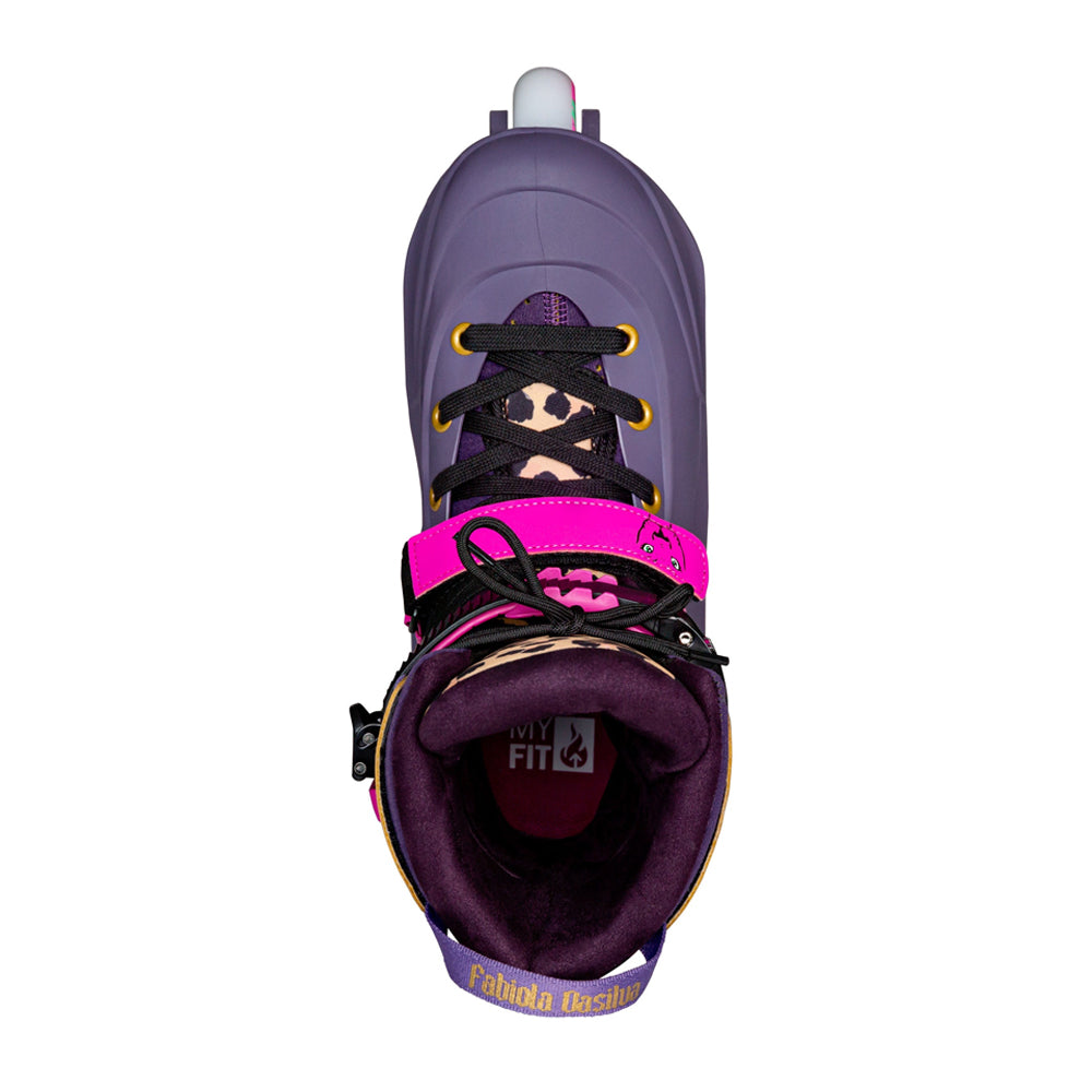 My skate also features a pink height-adjustable AEON cuff, providing the perfect flex—a great combination for all the bladies out there. I chose 45-degree straps across the instep for added support and stability, with a small lion’s face logo on top symbolizing resilience and power. For speed, my skates come with WICKED Abec 9 bearings and exclusive USD wheels (60mm, 88a), where we added my lion logo representing my gratitude to God.