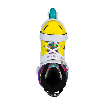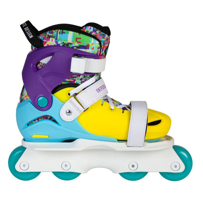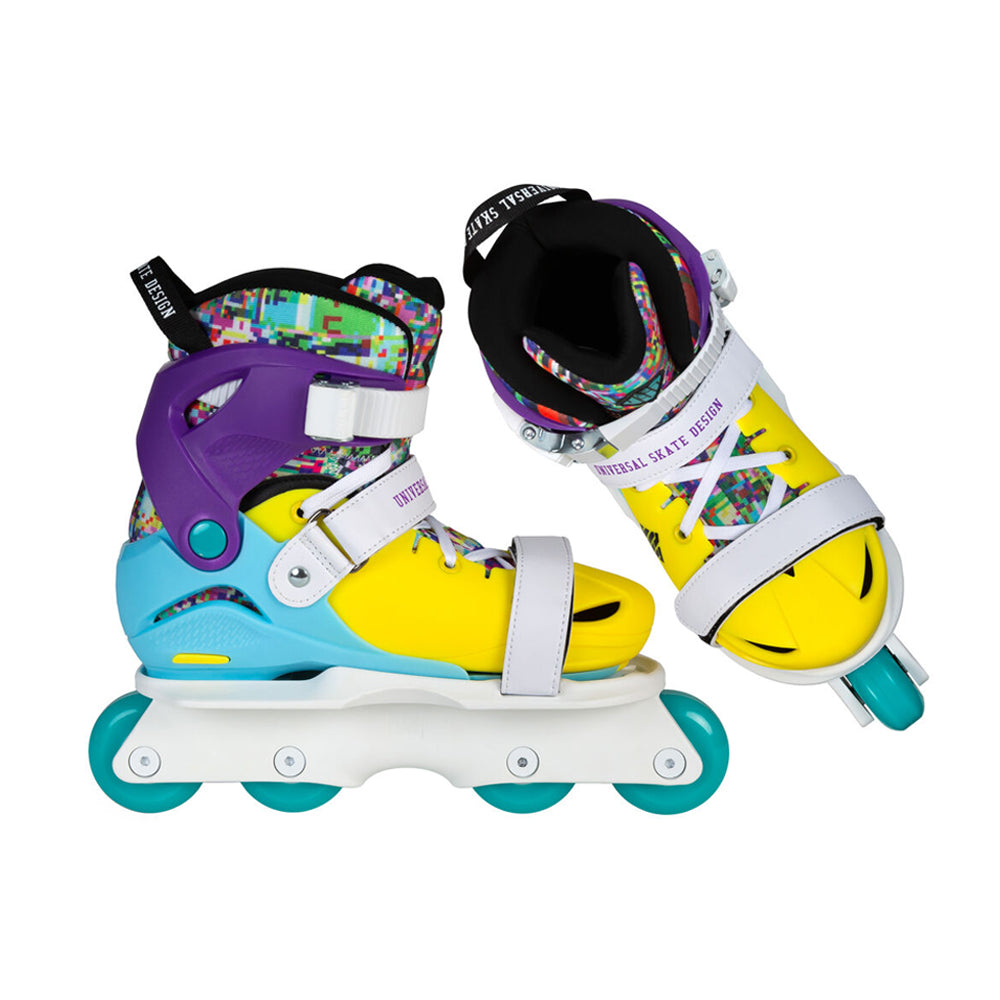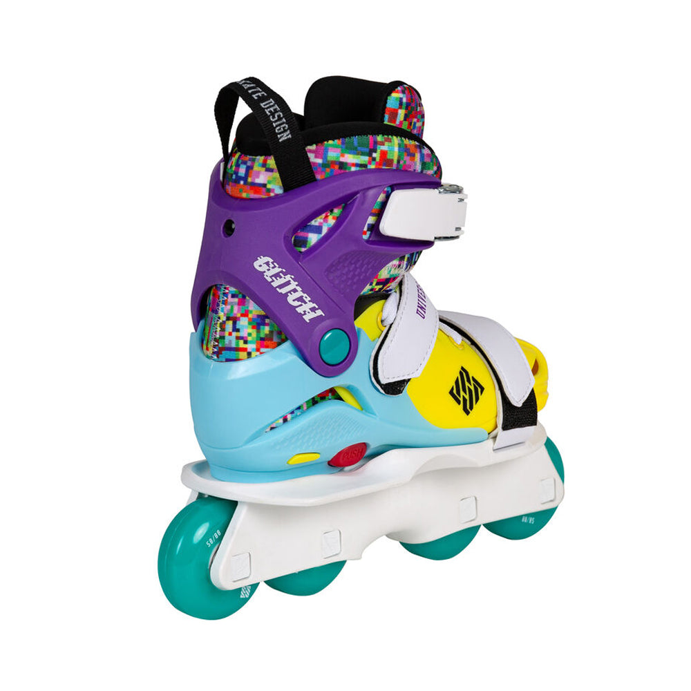 Introducing the USD Glitch, a sleek colorful inline skate packed with an abundance of features specifically designed for kids and aggressive skating. With its impressive speed, durability, and adjustable sizing, it is the ultimate all-around inline skate for active youngsters. Whether practicing foundational freestyle maneuvers or taking it to the park or rails, kids will have an exhilarating time on these inline skates. The Glitch boasts a cutting-edge Kizer Unibody soulframe, complete with a perfect groove for flat setups, enabling effortless grinding on any surface. Its low-to-the-ground design ensures fast sliding and remarkable durability. Additionally, the extra toe strap provides enhanced support and control, catering to aspiring pro skaters. Notably, this feature-rich inline skate can be easily adjusted to accommodate growing feet. Rest assured that your little one will enjoy a perfectly fitting, high-quality skate for many seasons to come. Equipped with USD wheels and WICKED bearings, this skate offers top-notch components, delivering a smooth and speedy ride that will undoubtedly bring joy to young skaters. Inspired by the cheerful skating of a new wave of younger shredders we proudly present the aggressive skate of the future to come.