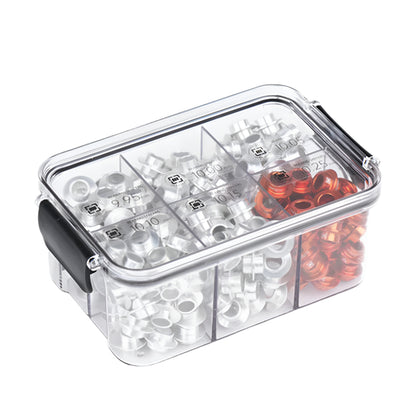 What are inclunded:-A box with 6 compartments and lockable lid-9.95mm spacers 32 pieces-10.00mm spacers 32 pieces-10.05mm spacers 32 pieces-10.10mm spacers 32 pieces-10.15mm spacers 32 pieces-10.25mm spacers(orange) 32 piecesThese measurements have covered...